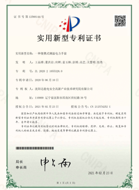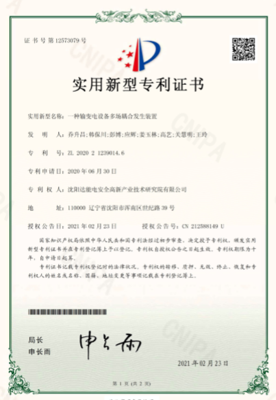 近日,沈陽達(dá)能電安全高新產(chǎn)業(yè)技術(shù)研究院(以下簡(jiǎn)稱達(dá)能研究院)榮獲由國家知識(shí)產(chǎn)權(quán)局頒發(fā)的實(shí)用新型專利證書《一種便攜式測(cè)溫電力手套及《一種輸變電設(shè)備多場(chǎng)耦合發(fā)生裝置》達(dá)能研究院積極踐行知識(shí)產(chǎn)權(quán)戰(zhàn)略,聚焦行業(yè)前沿技術(shù),深入開展產(chǎn)學(xué)研互動(dòng)。一種便攜式測(cè)溫電力手套聚焦測(cè)溫領(lǐng)域,貼合市場(chǎng)需求,便攜易操作,耐久性強(qiáng)?!兑环N輸變電設(shè)備多場(chǎng)耦合發(fā)生裝置》聚焦輸變配電設(shè)備安全管理,以前沿技術(shù)為輸變電設(shè)備提供安全保障。