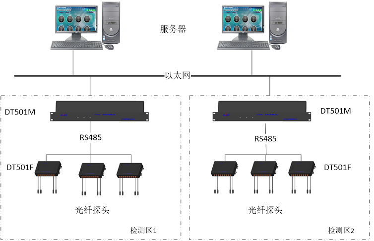 熒光光纖測(cè)溫系統(tǒng)由熒光光纖溫度解調(diào)儀(DT-501F)、光纖傳感探頭(DT-S100)、熒光光纖測(cè)溫主機(jī)(DT-501M)和系統(tǒng)管理軟件4部分組成。其中:光纖傳感探頭(DT-S100)將檢測(cè)位置的溫度信息轉(zhuǎn)換成光信號(hào);熒光光纖溫度解調(diào)儀(DT-501F)實(shí)時(shí)接收光纖傳感探頭送來的攜帶溫度信息的光信號(hào),將其解調(diào)成溫度值,實(shí)現(xiàn)對(duì)被檢測(cè)部位溫度測(cè)量;熒光光纖測(cè)溫主機(jī)(DT-501M)通過RS485總線方式連接多個(gè)熒光光纖溫度解調(diào)儀,將溫度信息、超溫報(bào)警信息以及系統(tǒng)狀態(tài)信息進(jìn)行數(shù)據(jù)匯總,通過以太網(wǎng)傳輸?shù)较到y(tǒng)管理軟件;系統(tǒng)管理軟件控制和顯示相關(guān)的溫度以及數(shù)據(jù)變化。