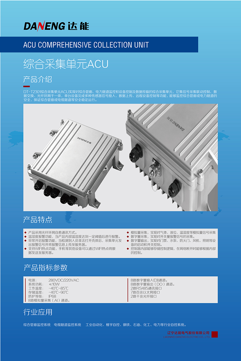 城市綜合管廊或電力隧道的安全穩(wěn)定運行,離不開綜合監(jiān)控系統(tǒng),而數(shù)據(jù)采集單元是監(jiān)控系統(tǒng)的重要組成部分。達能電氣自主研發(fā)生產(chǎn)的DT-T2301綜合采集單元ACU實現(xiàn)對綜合管廊、電力隧道監(jiān)控和設備控制及數(shù)據(jù)傳輸?shù)木C合采集單元,它集信號采集、聯(lián)動控制、數(shù)據(jù)交換、光纖環(huán)網(wǎng)于一體,單臺設備完成多種傳感器信號接入、數(shù)據(jù)上傳、遠程設備控制等功能,能夠監(jiān)控綜合管廊或電力隧道的安全,保證綜合管廊或電纜隧道等安全穩(wěn)定運行。