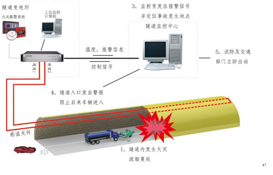 隧道是封閉的狹長(zhǎng)空間,交通量大,通風(fēng)條件差,發(fā)生火災(zāi)后煙氣大而且不易散發(fā), 容易對(duì)洞內(nèi)車(chē)輛、人員和設(shè)備安全構(gòu)成重大危害。光纖傳感系統(tǒng)可以準(zhǔn)確地探測(cè)到隧道全長(zhǎng)范圍內(nèi)的溫度分布情況,對(duì)隧道內(nèi)的溫度進(jìn)行實(shí)時(shí)、長(zhǎng)期的監(jiān)測(cè),并利用經(jīng)驗(yàn)值根據(jù)溫度情況做出合理判斷,在火災(zāi)發(fā)生之前對(duì)發(fā)展情況進(jìn)行掌控。當(dāng)有事故和火災(zāi)發(fā)生時(shí)迅速發(fā)出警報(bào),阻止后來(lái)車(chē)輛進(jìn)入隧道,將事故損失降至最低。