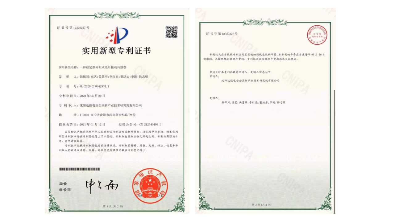 1月12日,沈陽(yáng)達(dá)能電安全高新產(chǎn)業(yè)技術(shù)研究院(以下簡(jiǎn)稱研究院)榮獲由國(guó)家知識(shí)產(chǎn)權(quán)局頒發(fā)的實(shí)用新型專利證書—《一種穩(wěn)定型分布式光纖振動(dòng)傳感器》,專利號(hào)ZL 2020 2 0842931.7。沈陽(yáng)達(dá)能電安全高新產(chǎn)業(yè)技術(shù)研究院是達(dá)能電氣旗下研發(fā)機(jī)構(gòu),是公司重點(diǎn)打造的創(chuàng)新研發(fā)機(jī)構(gòu)。2020年度,達(dá)能研究院累計(jì)榮獲5項(xiàng)實(shí)用新型專利證書、7項(xiàng)軟件著作權(quán)證書,這是達(dá)能專注研發(fā)創(chuàng)新,加速科技成果轉(zhuǎn)化,推動(dòng)知識(shí)產(chǎn)權(quán)戰(zhàn)略實(shí)施的有效成果。