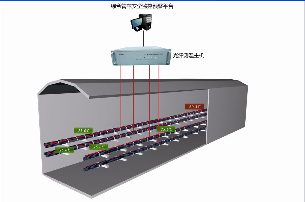 溫度監(jiān)測是目前國內(nèi)外電纜運(yùn)行監(jiān)測中被認(rèn)可的一項重要手段。電纜接頭阻抗增加、電纜負(fù)荷過大、絕緣皮老化或者電纜本身局放等原因,致使電纜表面產(chǎn)生溫升,電纜絕緣層和保護(hù)層產(chǎn)生陰燃,并伴隨熱量、可燃?xì)怏w的產(chǎn)生,隨著溫度進(jìn)一步上升則產(chǎn)生煙霧,進(jìn)而發(fā)展為火災(zāi)。分布式測溫系統(tǒng)通過實(shí)時監(jiān)測電纜溫度變化,在事故發(fā)生初期準(zhǔn)確判斷異常,提前預(yù)警,并精確定位,防患于未然